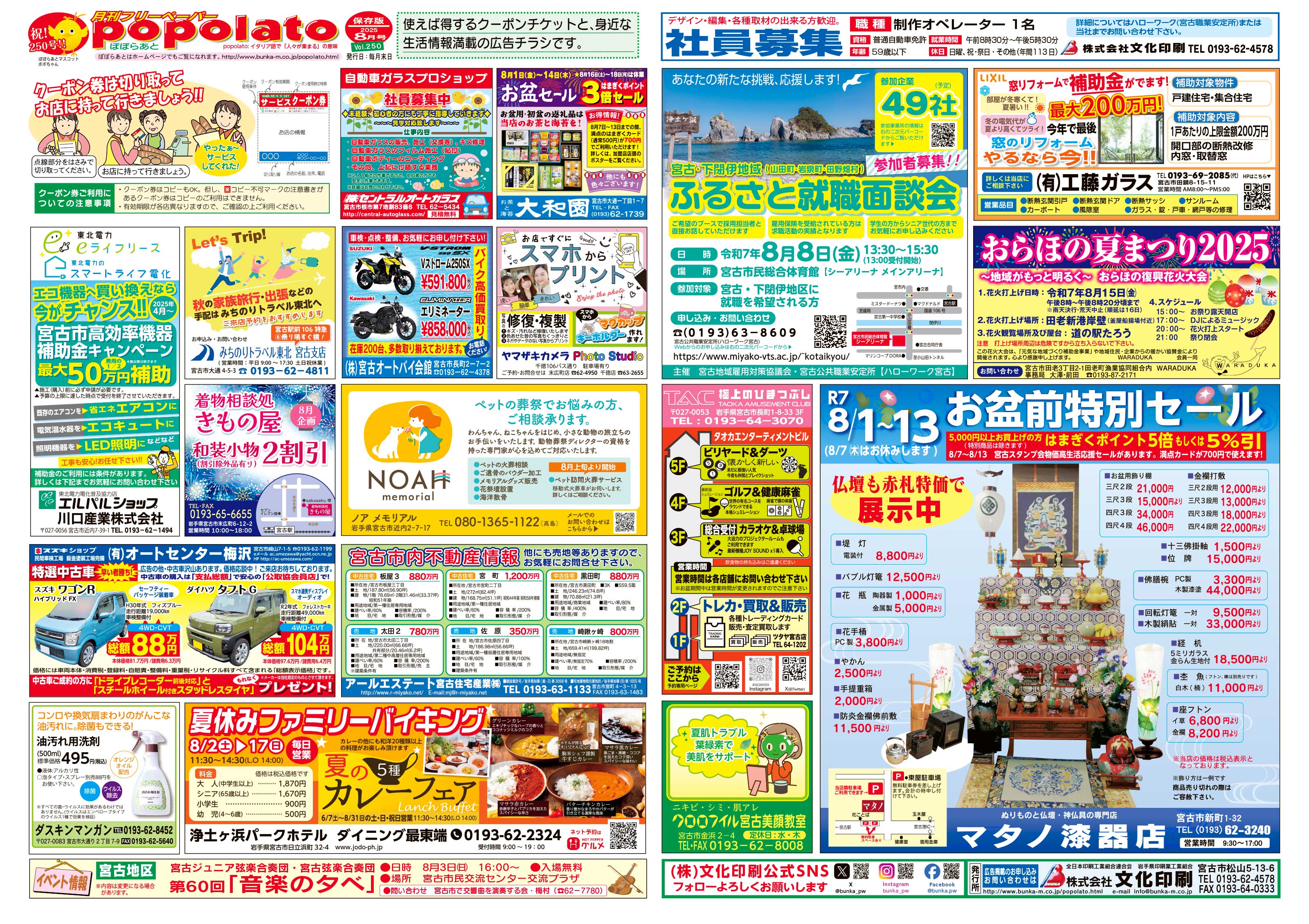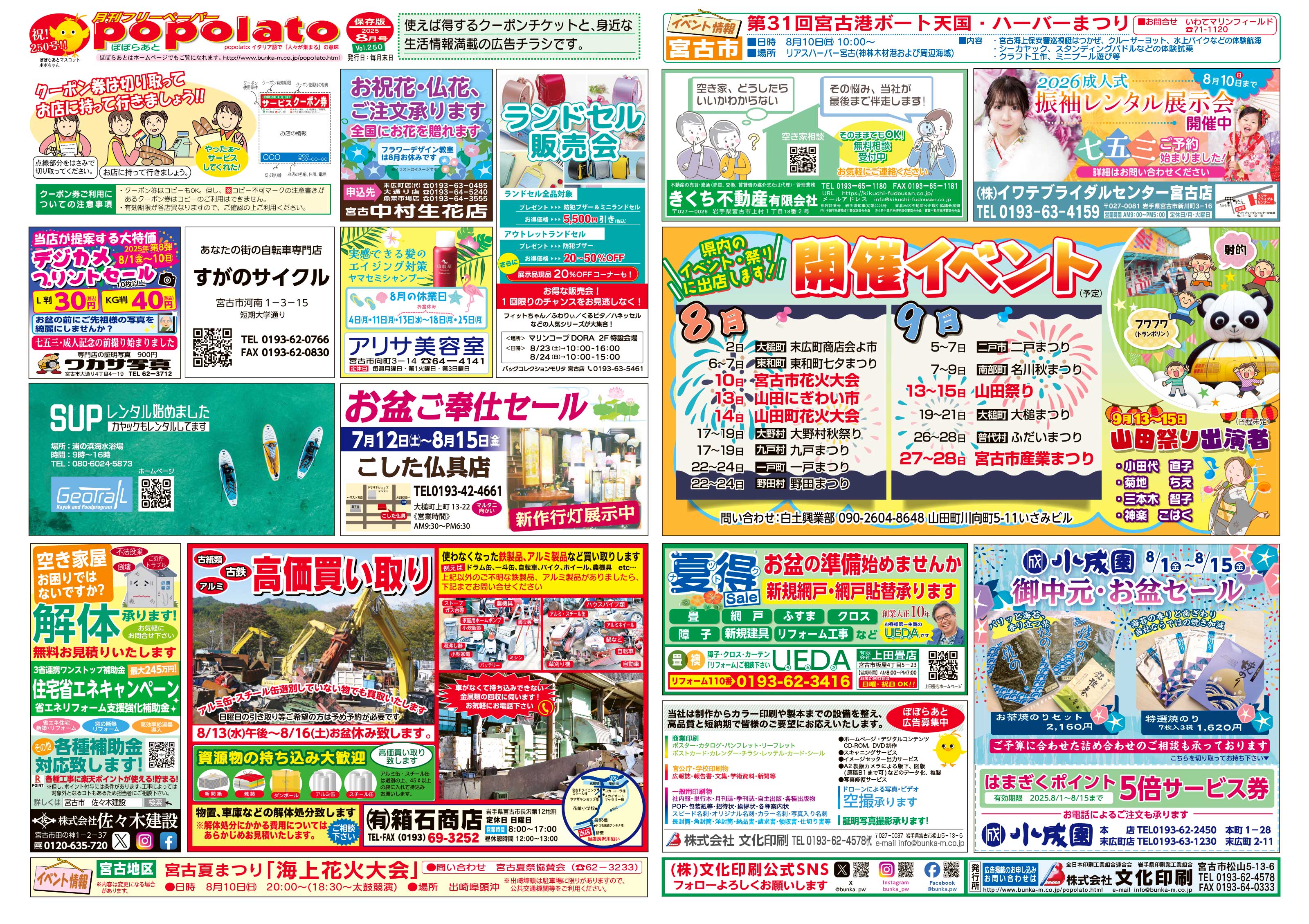 ぽぽらあとは弊社、企画・発行の両面カラー印刷による情報誌で、宮古市・山田町・岩泉町・田野畑村・大槌町地区の岩手日報・読売新聞・毎日新聞・朝日新聞・サンケイ・河北新報に、20,400部折り込み、毎月末に発行しています。