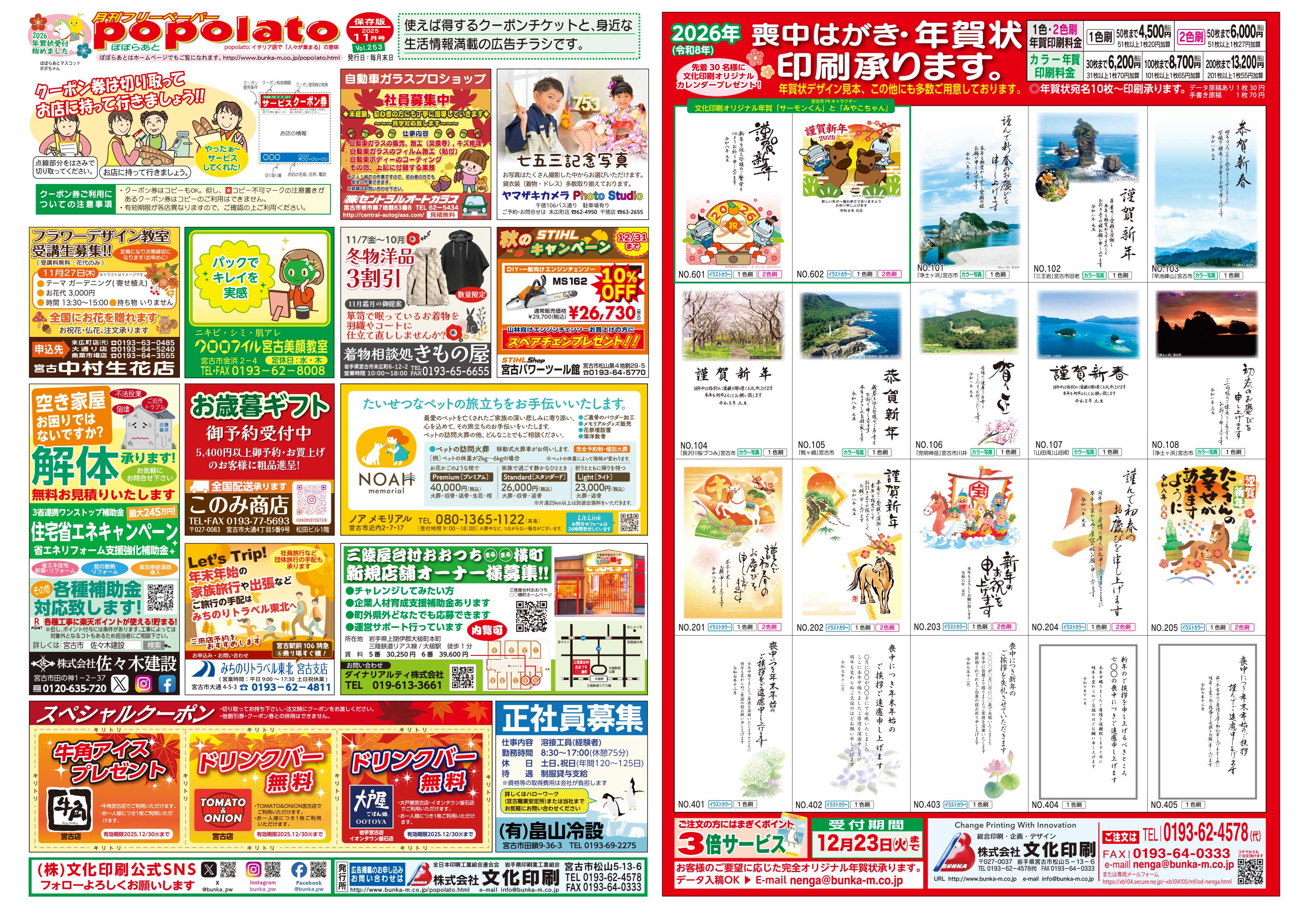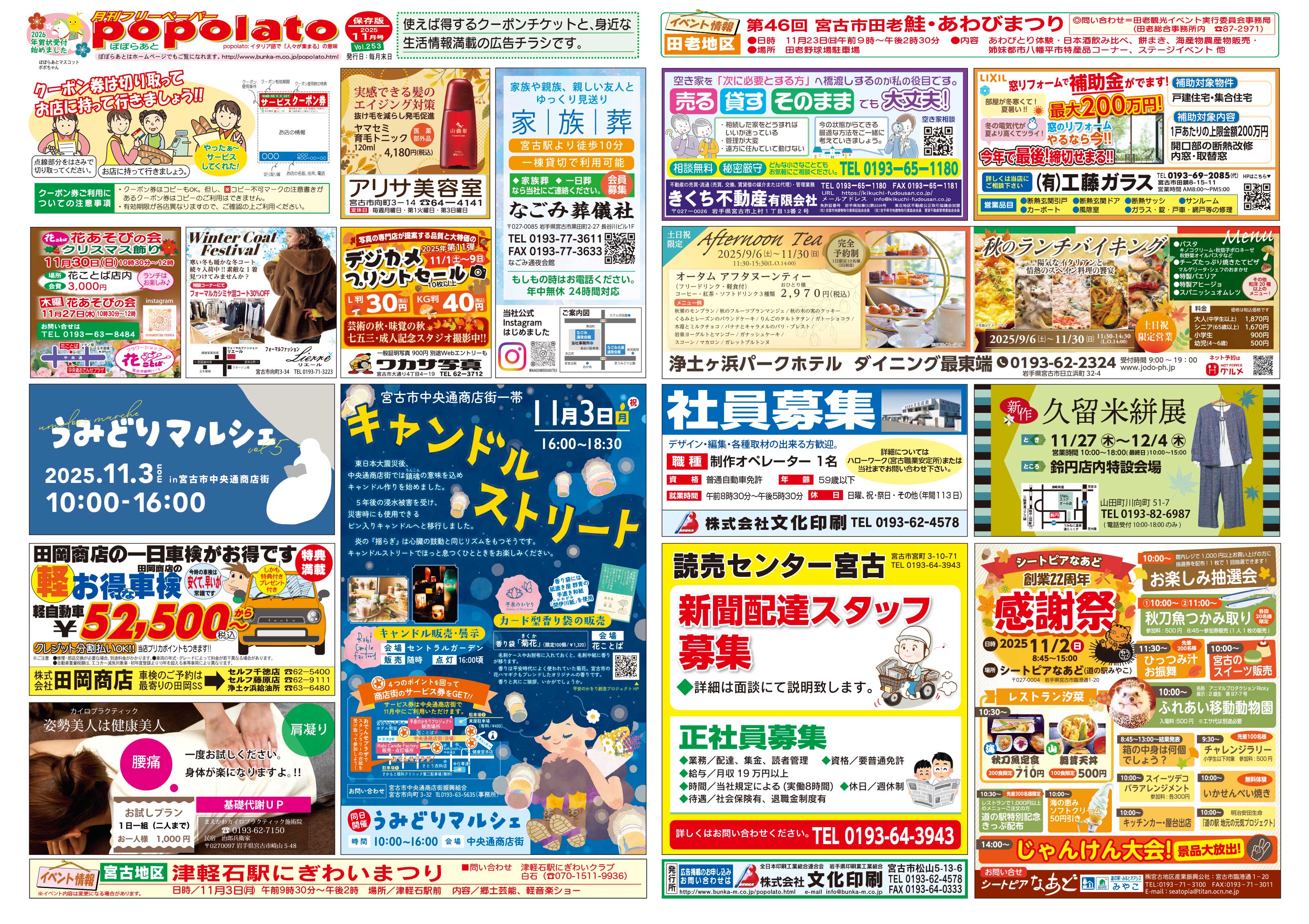 ぽぽらあとは弊社、企画・発行の両面カラー印刷による情報誌で、宮古市・山田町・岩泉町・田野畑村・大槌町地区の岩手日報・読売新聞・毎日新聞・朝日新聞・サンケイ・河北新報に、20,400部折り込み、毎月末に発行しています。