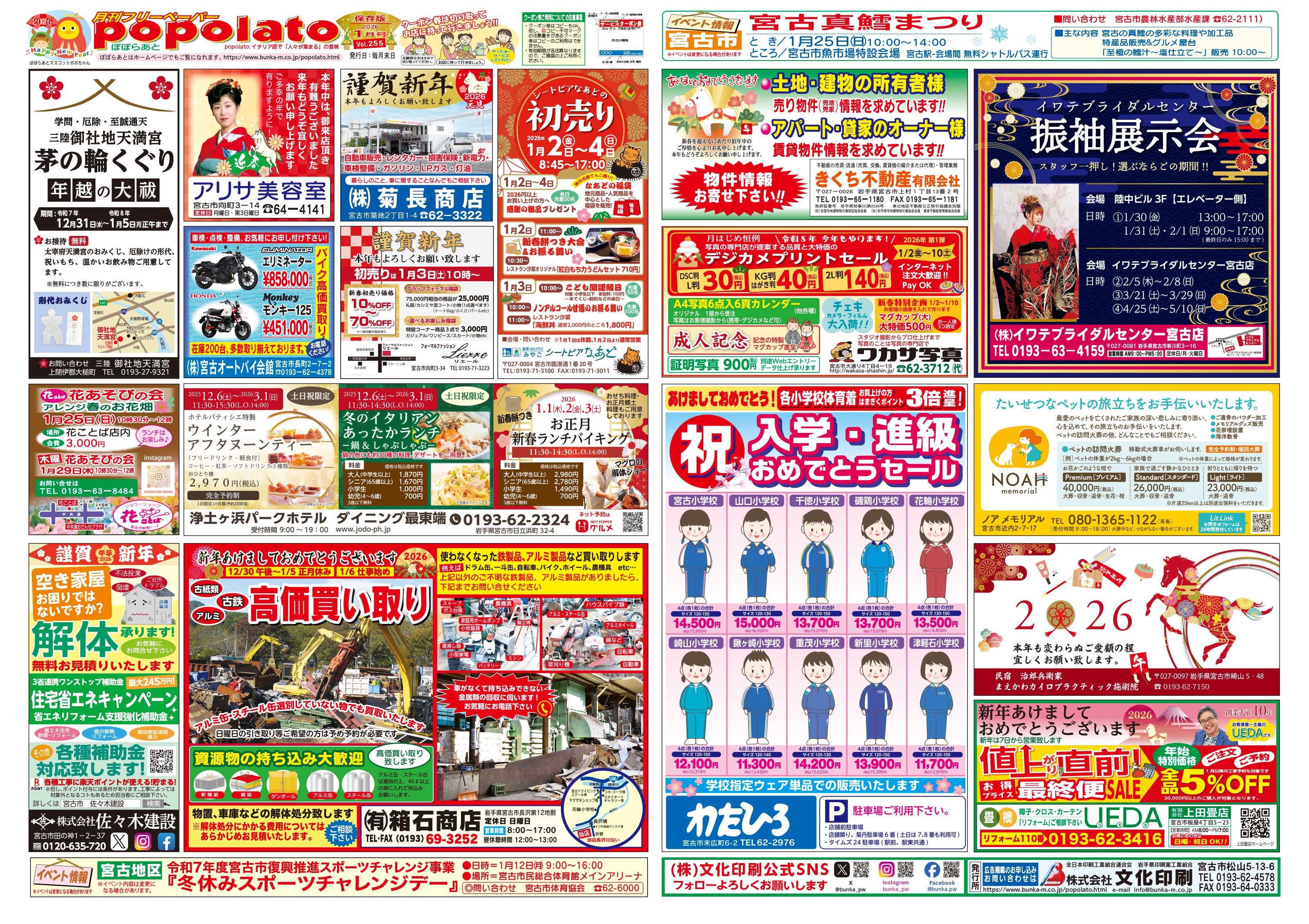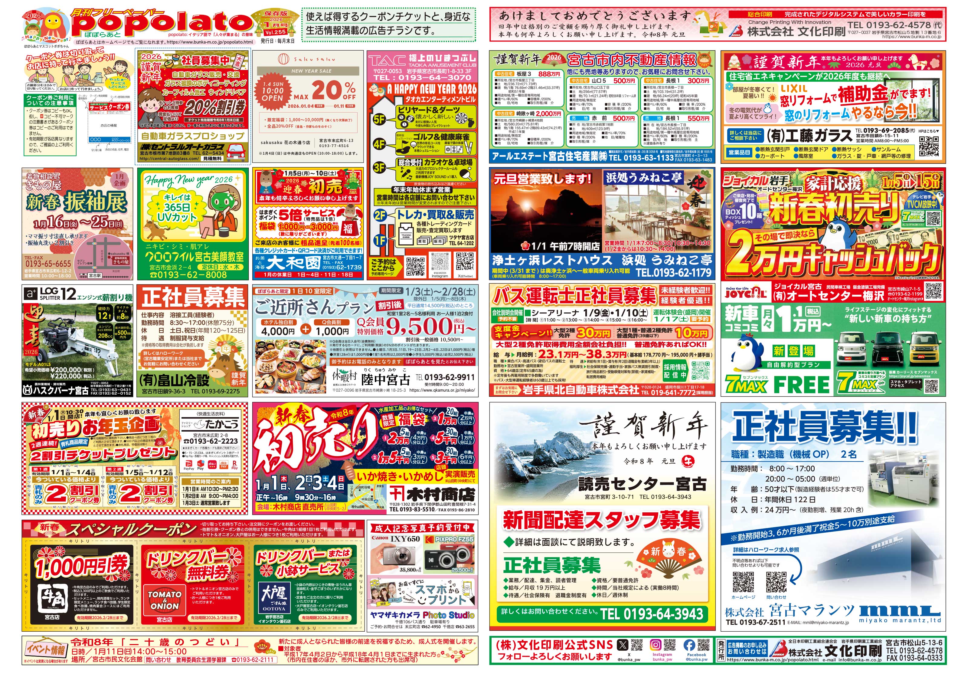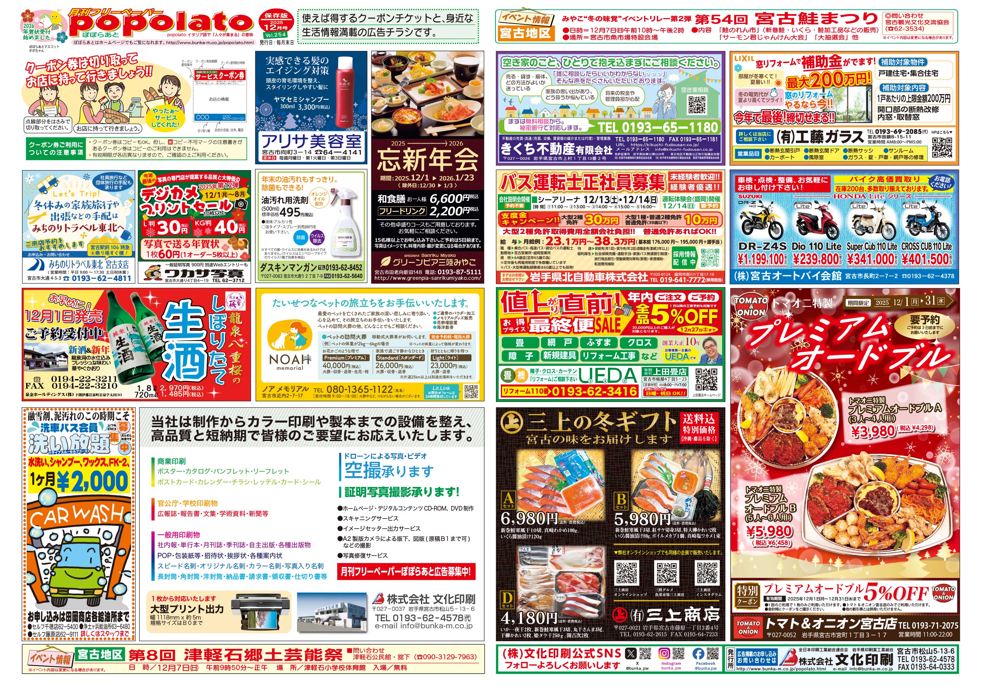 ぽぽらあとは弊社、企画・発行の両面カラー印刷による情報誌で、宮古市・山田町・岩泉町・田野畑村・大槌町地区の岩手日報・読売新聞・毎日新聞・朝日新聞・サンケイ・河北新報に、20,400部折り込み、毎月末に発行しています。