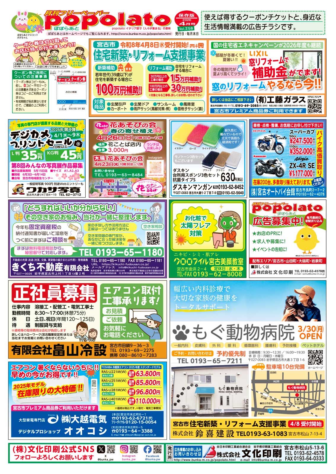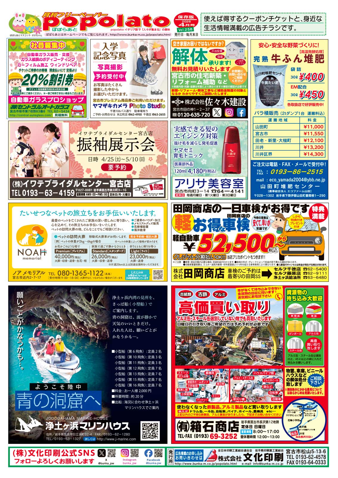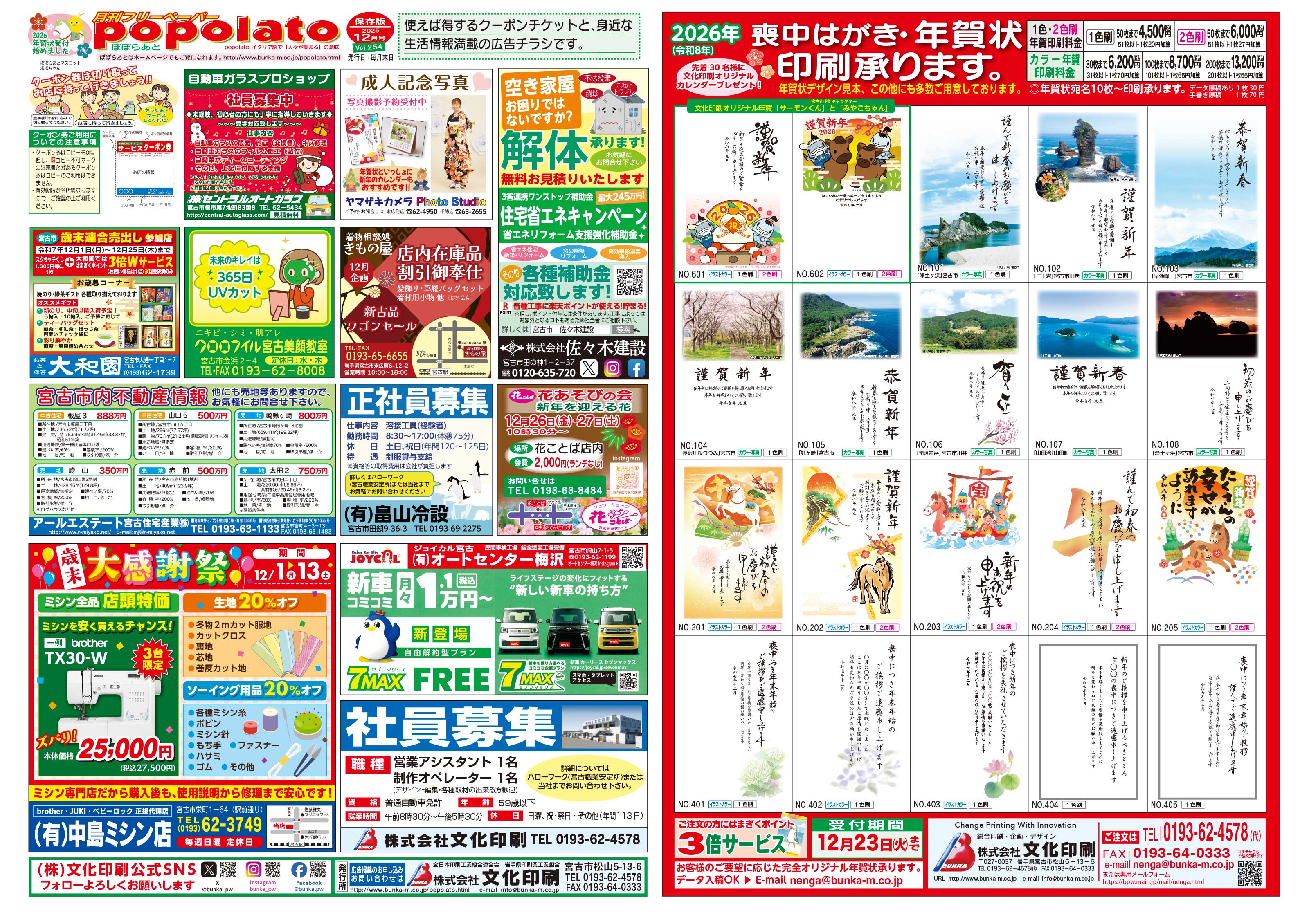 ぽぽらあとは弊社、企画・発行の両面カラー印刷による情報誌で、宮古市・山田町・岩泉町・田野畑村・大槌町地区の岩手日報・読売新聞・毎日新聞・朝日新聞・サンケイ・河北新報に、20,400部折り込み、毎月末に発行しています。